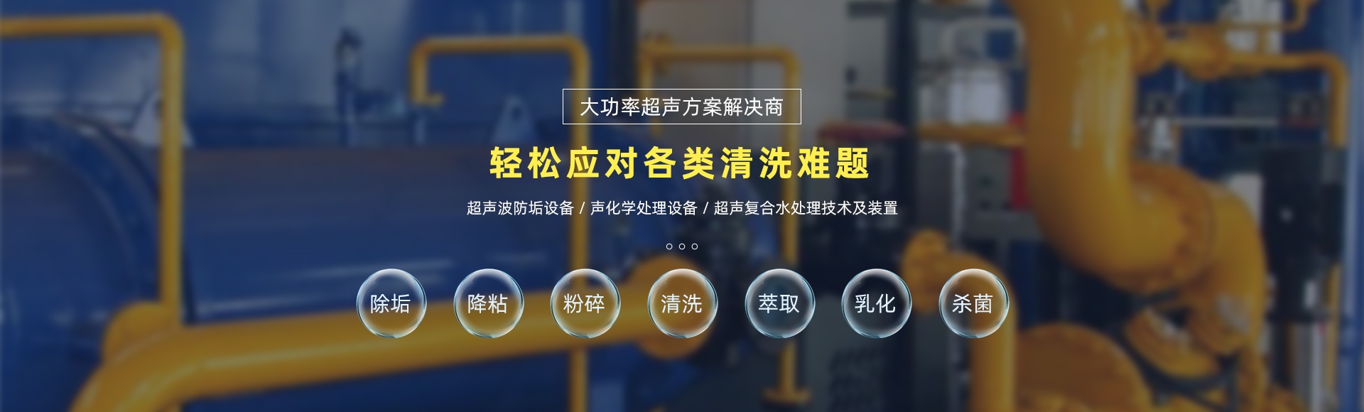 超聲波防除垢系列設備、超聲波破乳除油設備、超聲波鉆井廢液處理裝置、聚能式超聲波流體處理設備、超聲臭氧復合水處理技術及裝置、超聲電脫鹽復合技術及裝置、超聲波污泥處理技術及裝置、超聲氨氮吹脫技術及裝置、超聲中藥提取純化技術及裝置等超聲復合處理技術及裝置是“九洲”功率超聲應用的主要成果。